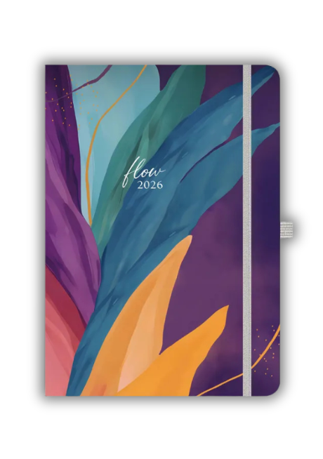 Ημερήσιο ημερολόγιο 2026 με ευρετηρίαση με αφαιρετικό σχεδιασμό, εύπλαστα συνειρμικά σχήματα με έντονα χρώματα και εύκαμπτη βιβλιοδεσία με ανάγλυφη υφή.