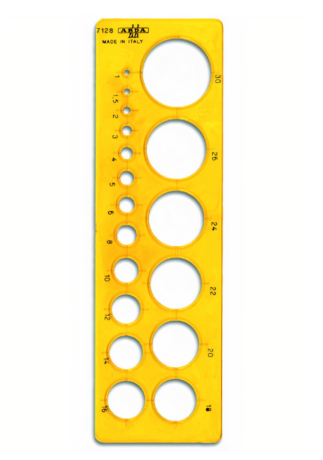 Στένσιλ κύκλων ARDA 7128. Οι εξωτερικές του διαστάσεις είναι 6x19cm. Ο μικρότερος κύκλος είναι διαμέτρου 1mm και ο μεγαλύτερος διαμέτρου 30mm.
